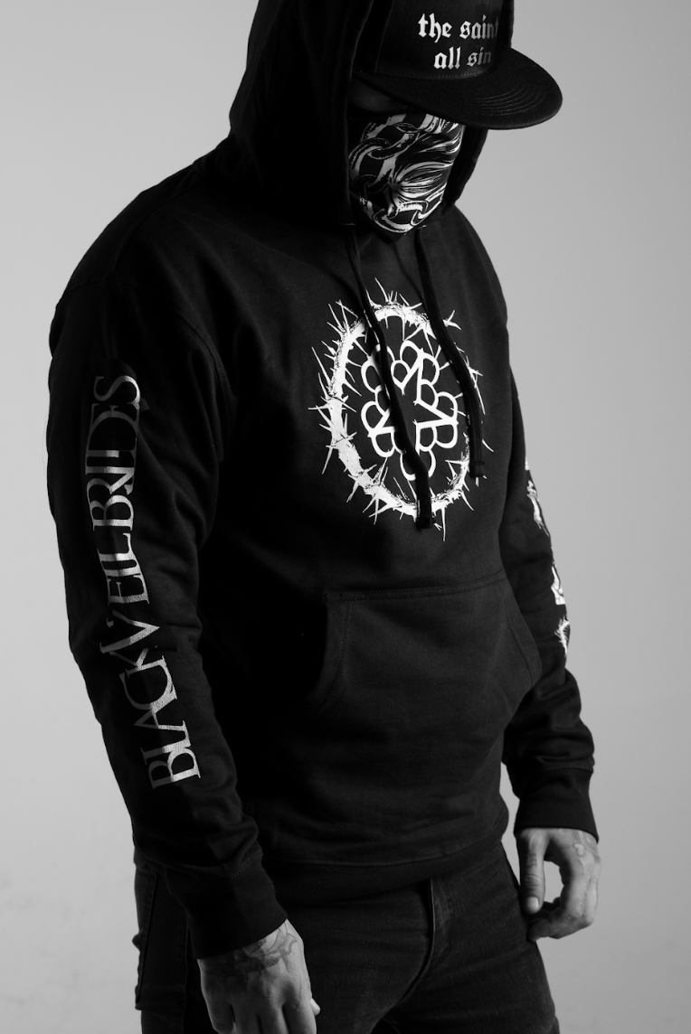 6 panel pro style snapback hat with large raised embroidery of "the saints are all sinners" on front, and Black Veil Brides logo on right side.